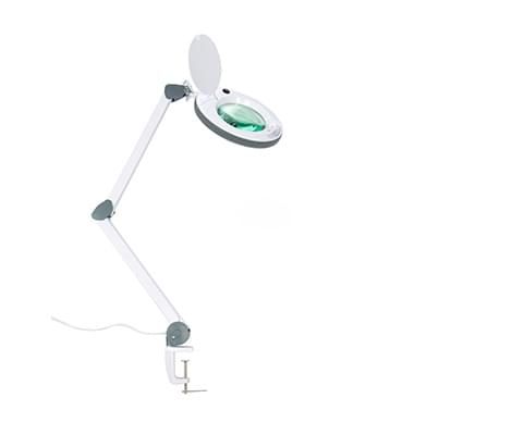 Лампа-лупа 3 диоптрии на струбцине, фокусное расстояние до поверхности 25 - 35 см, супертонкое стекло высокой четкости, диаметр линзы 15 см, 60 светодиодов и 5 режимов интенсивности освещения, ручка для регулировки положения лампы, качественный и мягкий на ощупь пластик "Soft touch"