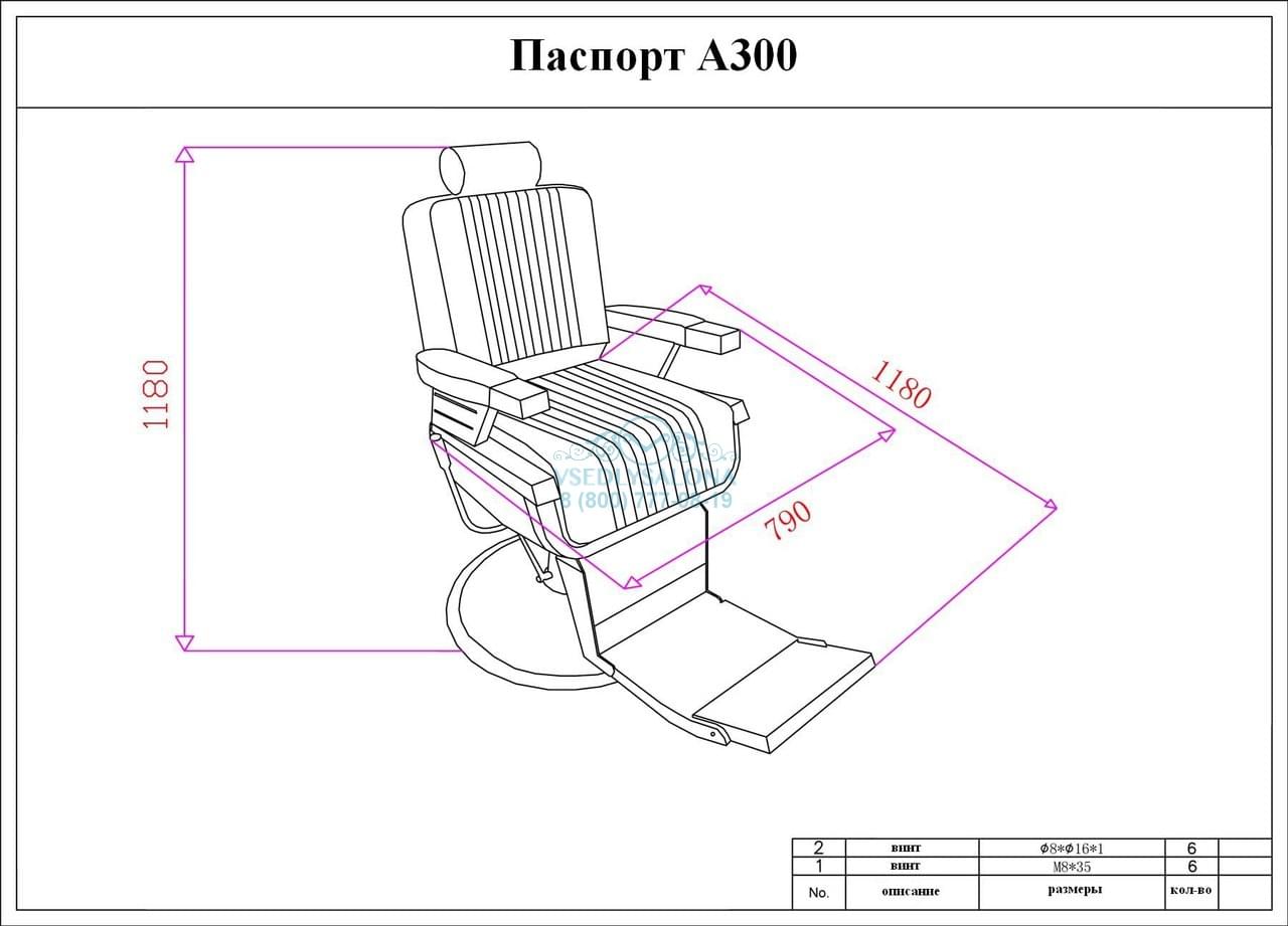 Кресло барбершоп "A300" имеет отклоняемую спинку кресла и синхронизированную с отклонением спинки подножку. Подголовник съёмный.