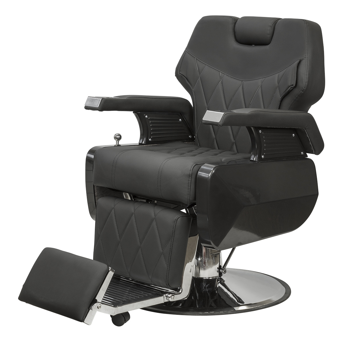 Каркас и основа из прочной стали отвечает за устойчивость массивной мебели для барбершопа. Обивка выполнена из фирменной экокожи с влагостойкими качествами. Спинка, сиденье и подножка украшены стильной прошивкой крупными ромбами. Для наполнителя использован упругий поролон. Благодаря своей структуре материал быстро восстанавливает форму после каждого использования.