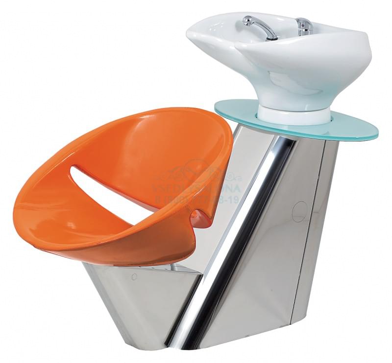 Мойка парикмахерская с креслом. Каркас мойки выполнен из хромированного металла, имеет округлую полку для шампуней из матового стекла. Комплектуется белой, черной или синей керамической раковиной. Кресло изготовлено из высококачественного поролона, обтянутого искусственной кожей высшего качества.