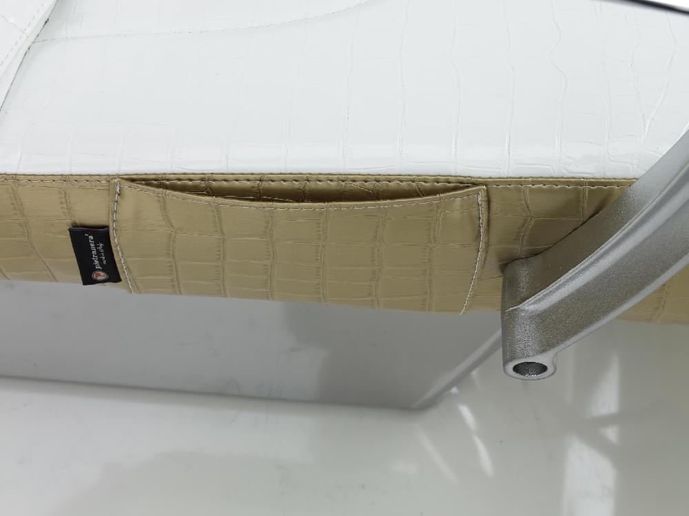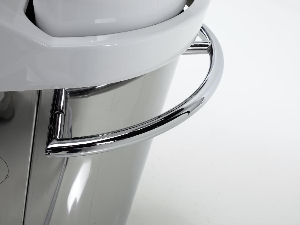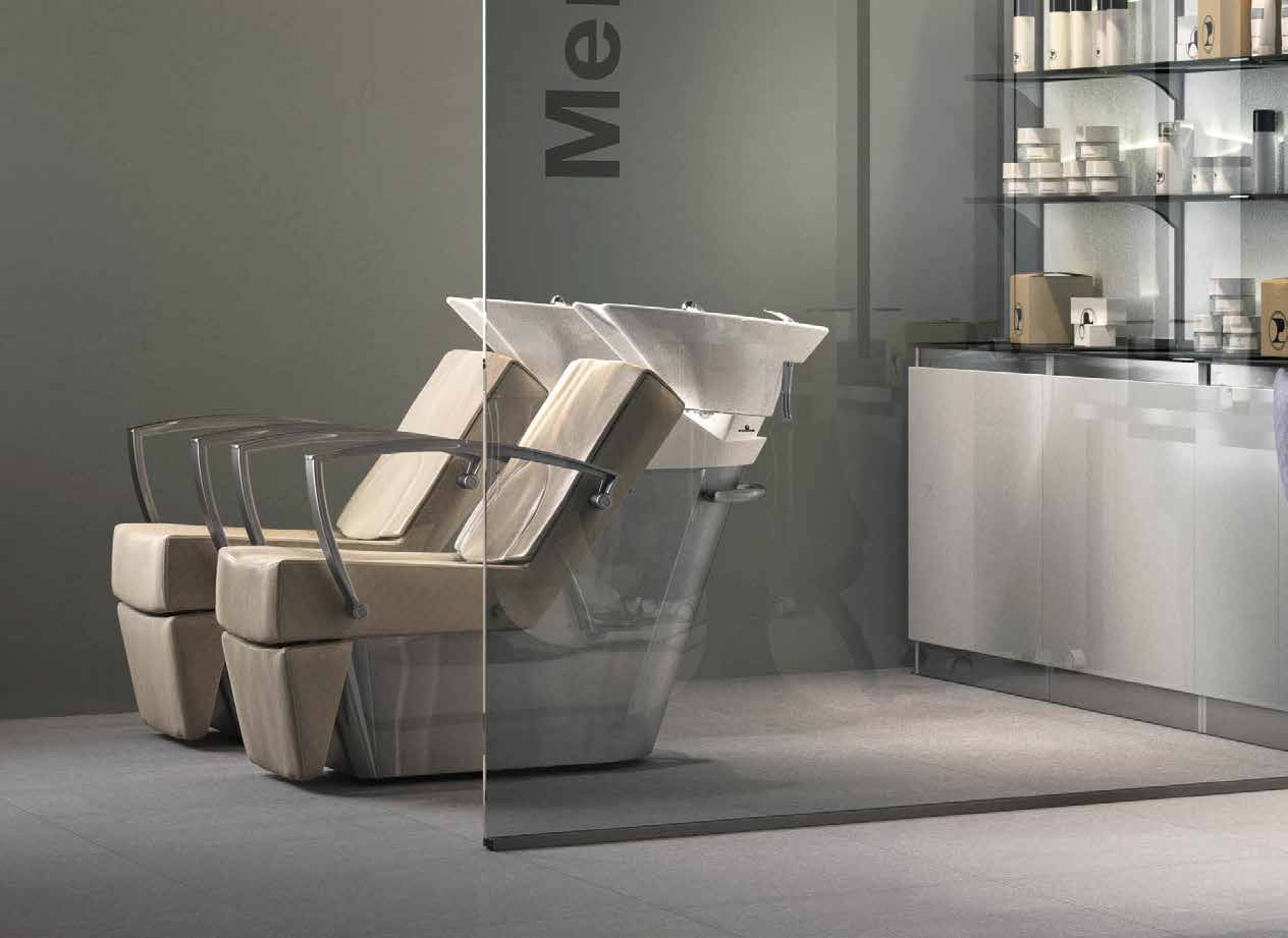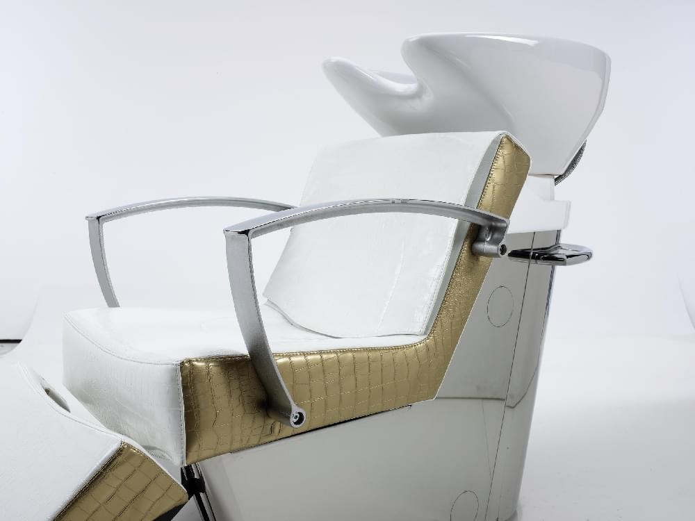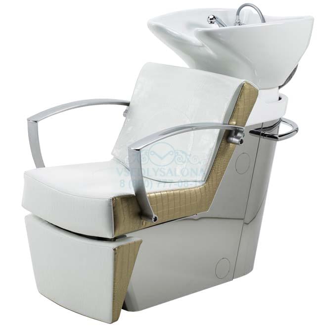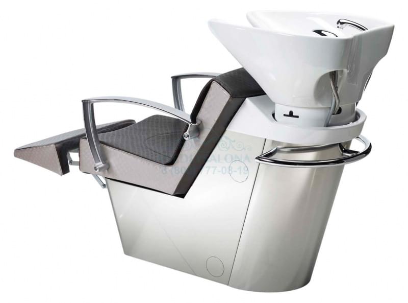 Мойка с креслом на алюминиевом каркасе. Комплектуется средней, глубокой керамической раковиной белого или черного цвета, с регулировкой угла наклона, комплектом смесителя с хромированной лейкой душа. Каркас кресла выполнен из металла, мягкие элементы обтянуты искусственной кожей высшего качества, кресло с электрической подножкой, легкое управение с помощью ручного пульта. Подлокотники хромированные. Возможен вариант с электической подножкой и воздушным массажем или без подножки и без массажа.