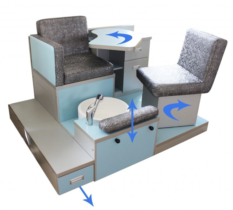 Пожалуй одним из основных желаний мастеров как маникюра, так и педикюра, остается желание чтобы все необходимое всегда было под рукой. Желание многих можно осуществить с СПА-комплексом «Руфик». Это не только комфортабельное место для клиента, но и удобное расположение всех инструментариев и приборов для мастера. При наличии такого комплекса совершенно не нужно переживать об устройстве уголка маникюра или педикюра, поскольку он объединяет все это в себе. Такой СПА-комплекс можно считать полноценной комнатой красоты. Здесь и удобный столик для маникюра с максимальным комфортом расположен как к клиенту, так и к мастеру, и все необходимое для педикюра. Также, помимо прочего, есть несколько миниатюрных ящичков для необходимого инвентаря в работе. Кресло клиента также избирательно учитывалось при планировке, оно повернуто таким образом, чтобы обеспечить максимальный доступ и для маникюра и для педикюра.