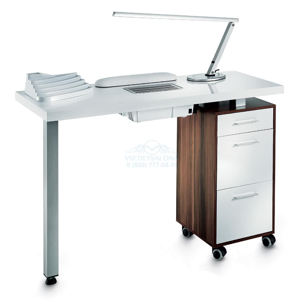 Маникюрный стол с одной тумбой, вытяжкой, столешница покрыта белым лаком, тумба ламинированная с тремя выдвижными ящиками, на колесах. В комплекте: лампа, подушка маникюрная, подставка под лаки. Цвет: столешница белая/тумба орех/ящики белые. Возможен вариант без вытяжки. Размер: 115х50х79