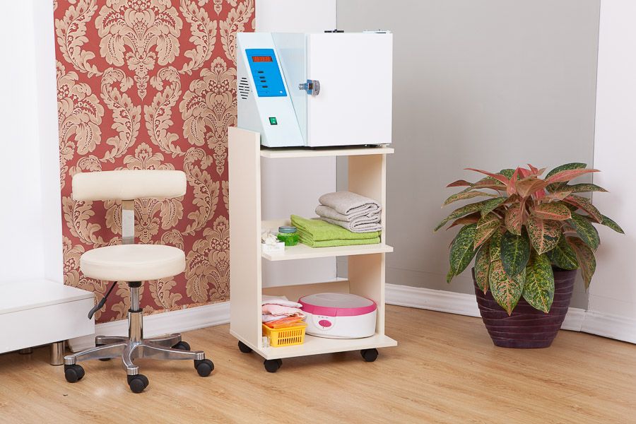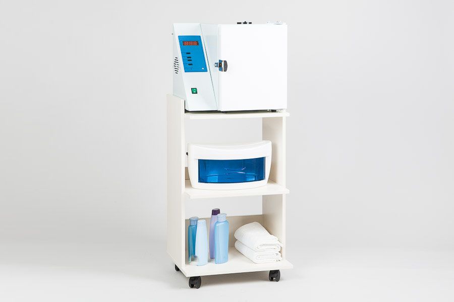 Столик косметолога три полки на колесах. Удобный косметологический столик-тележка с тремя полкапи, ограниченными бортиками с трех сторон. Расстояние между полками 33 см. позволяет ставить высокие флаконы с косметологическими средствами. Влагостойкое ламинированное ДСП порзволяет протирать и обрабатывать столик дез средствами.