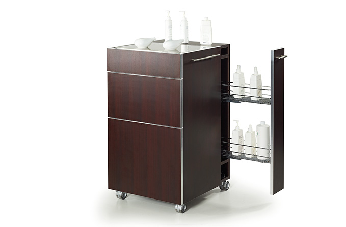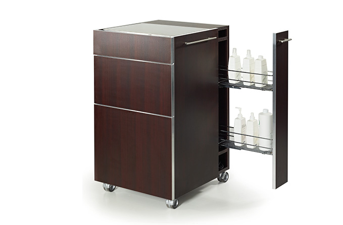 Модель имеет несколько выдвижных ящиков, а также отделений с распашными дверцами. Мобильность тумбы достигается за счет наличия бесшумных колесиков. В комплектацию входит холодильник, нагреватель для полотенец, нагревательная плита. Данная модель – один из лучших вариантов сочетания функциональности, стильного дизайна и отменного качества.